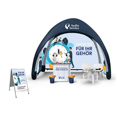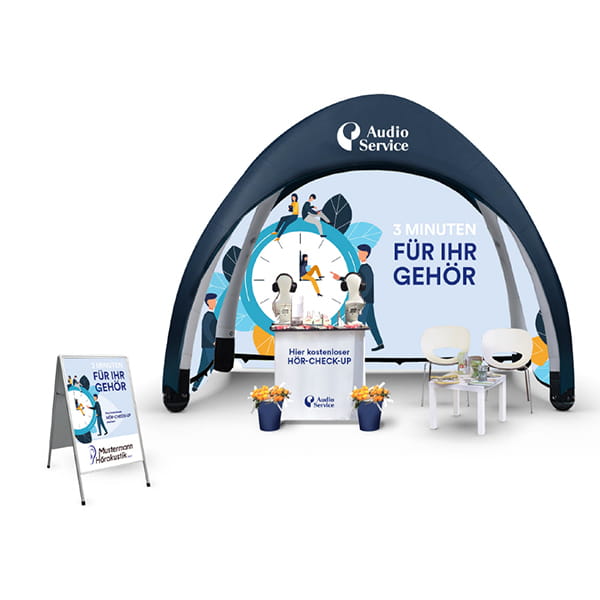 Eine ansprechende Gestaltung und zwei hohe Fahnenmasten für die Fernwirkung verschaffen unserer Top-Aktion ein aufmerksamkeitsstarkes Aussehen. Flexible Hörtests auch ohne Geschäft in der Nähe.